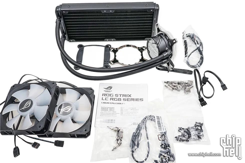 ROG STRIX LC 240全家福,水冷主体,两个带RGB、AMD和Intel夹子的风扇,USB控制线,螺丝配件套件,风扇电源适配器线和风扇灯效线,安装指南。