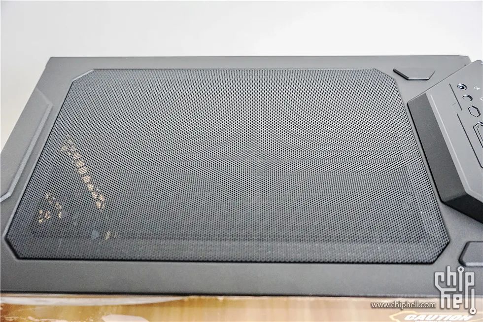 GT301的顶部是一个磁性灰尘过滤器。 取下后可以看到顶部的风扇固定孔。 支持240水冷或双120mm风扇。