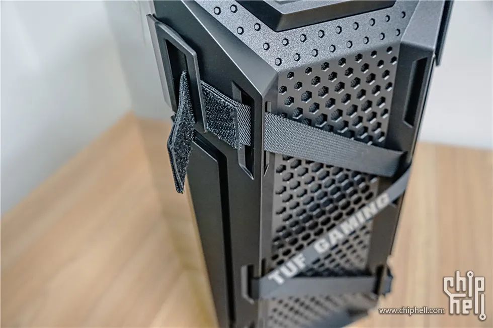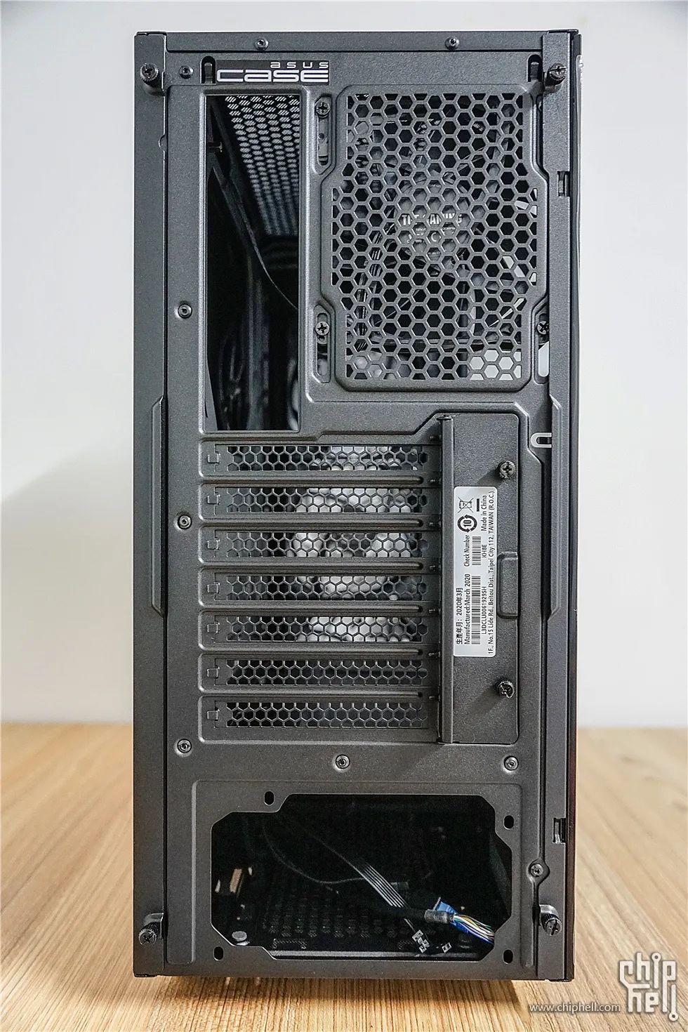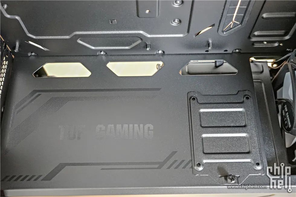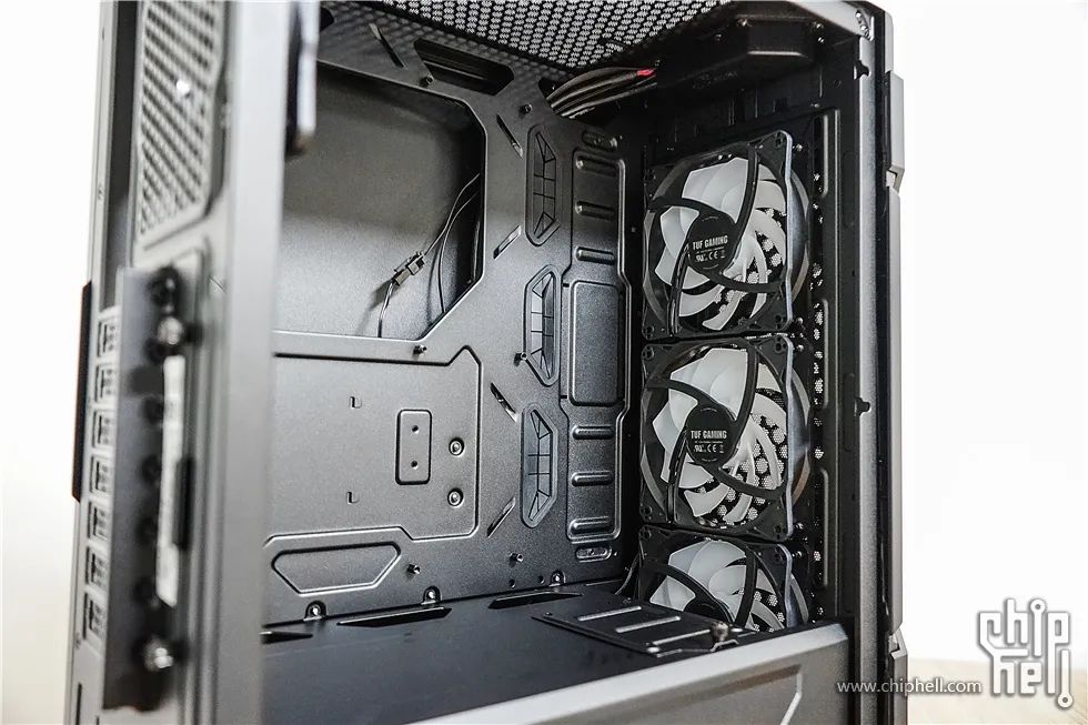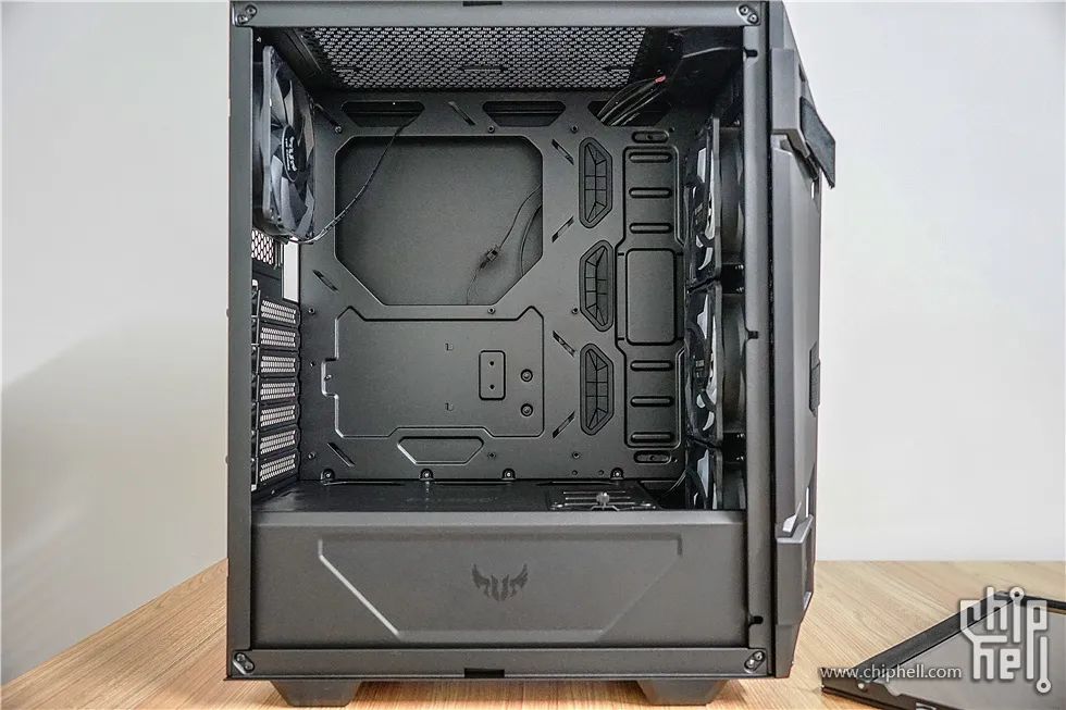 作为一款标准的中塔机箱,GT301拥有精心设计的内部设计。 电缆孔有橡胶保护。 电源舱是独立的。 电源挡板上有TUF标志。 如果有灯光效果就更完美了。