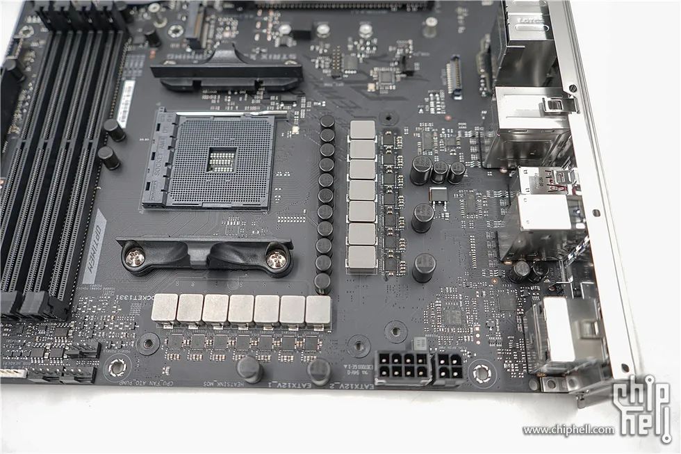 拆掉散热片后,14相电源完全暴露出来。 这次STRIX X570-F GAMING的用料还是很稳定的。 CPU供电采用8pin+4pin。