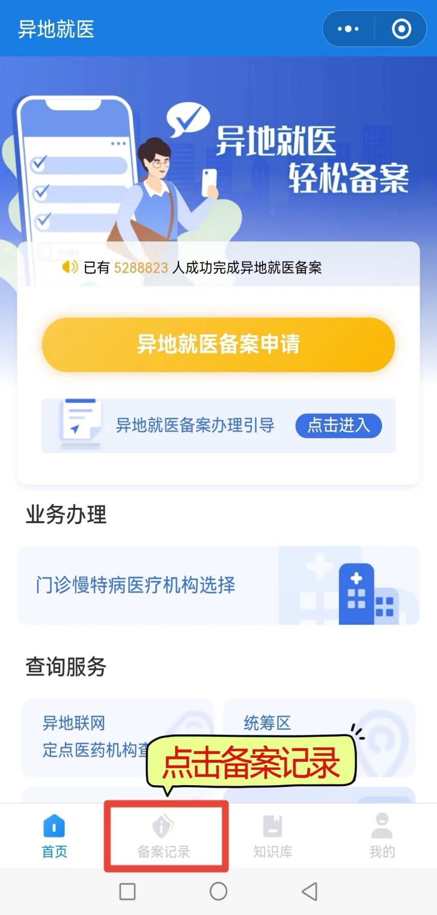 点击首页【备案记录】按钮,进入远程就医备案页面,实时查看备案进度。