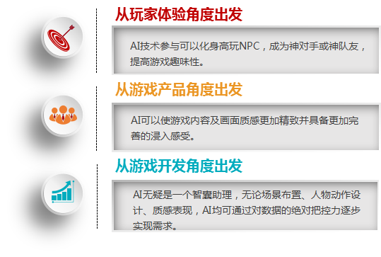 基于整个AI技术发展史都嵌入到游戏发展史中,游戏可以说是AI的原配。 优质游戏培养高智能AI,完美的AI技术回归游戏本身,推动产业发展。 人工智能与游戏相互促进、共同发展,形成良性循环。 “AI+游戏”的结合堪称绝配。 人工智能时代,游戏无处不在,智能将无处不在。
