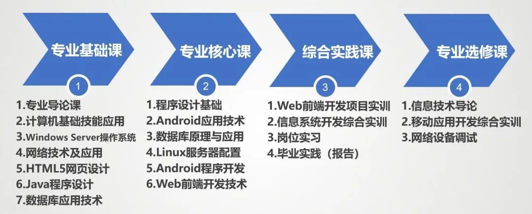 计算机应用技术专业课程按照专业基础课、专业核心课、综合实践课和专业选修课四个模块组织教学。 专业基础课主要讲授计算机应用技术基础课程。 通过计算机基础应用技能训练,使学生掌握办公软件、数据库管理系统软件、操作系统、面向对象编程、网页设计与制作等应用技能。 专业核心课程主要讲授网络操作系统、移动应用开发技术、数据库管理技术、前端开发技术等。综合实践课程主要讲授Web前端开发项目实训、信息系统开发综合实训等课程,使学生能够综合运用专业技能解决问题。 专业选修课主要讲授信息技术概论、移动应用开发综合实训、网络设备调试等课程,使学生适应不断发展的计算机应用环境。
