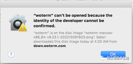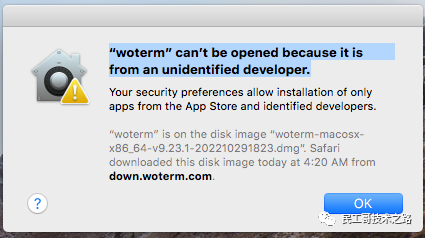 xattr -d com.apple.quarantine woterm-macosx-xxxx.dmg