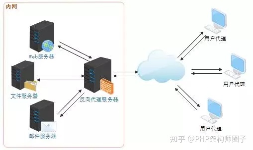 互联网中的请求发送给反向代理,反向代理把请求转发到内网中的服务器。
